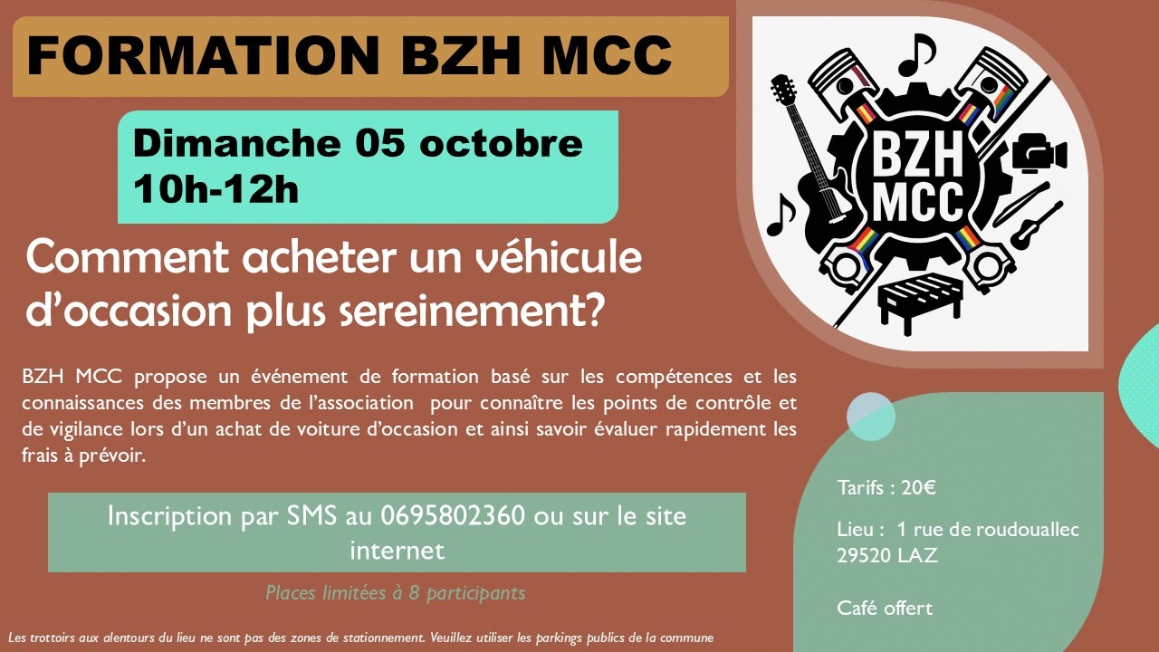 BZH MCC propose un évènement de formation basé sur les compétences et les connaissances des membres de l’association pour connaître les points de contrôle et de vigilance lors d’un achat de voiture d’occasion et ainsi savoir évaluer rapidement les frais à prévoir.