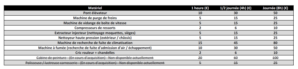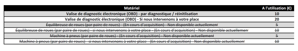 Consultez le barème complet (à l’heure / ½ journée / journée) et les tarifs à l’utilisation pour certaines opérations (ex. valise OBD, machine à pneus, équilibreuse).
